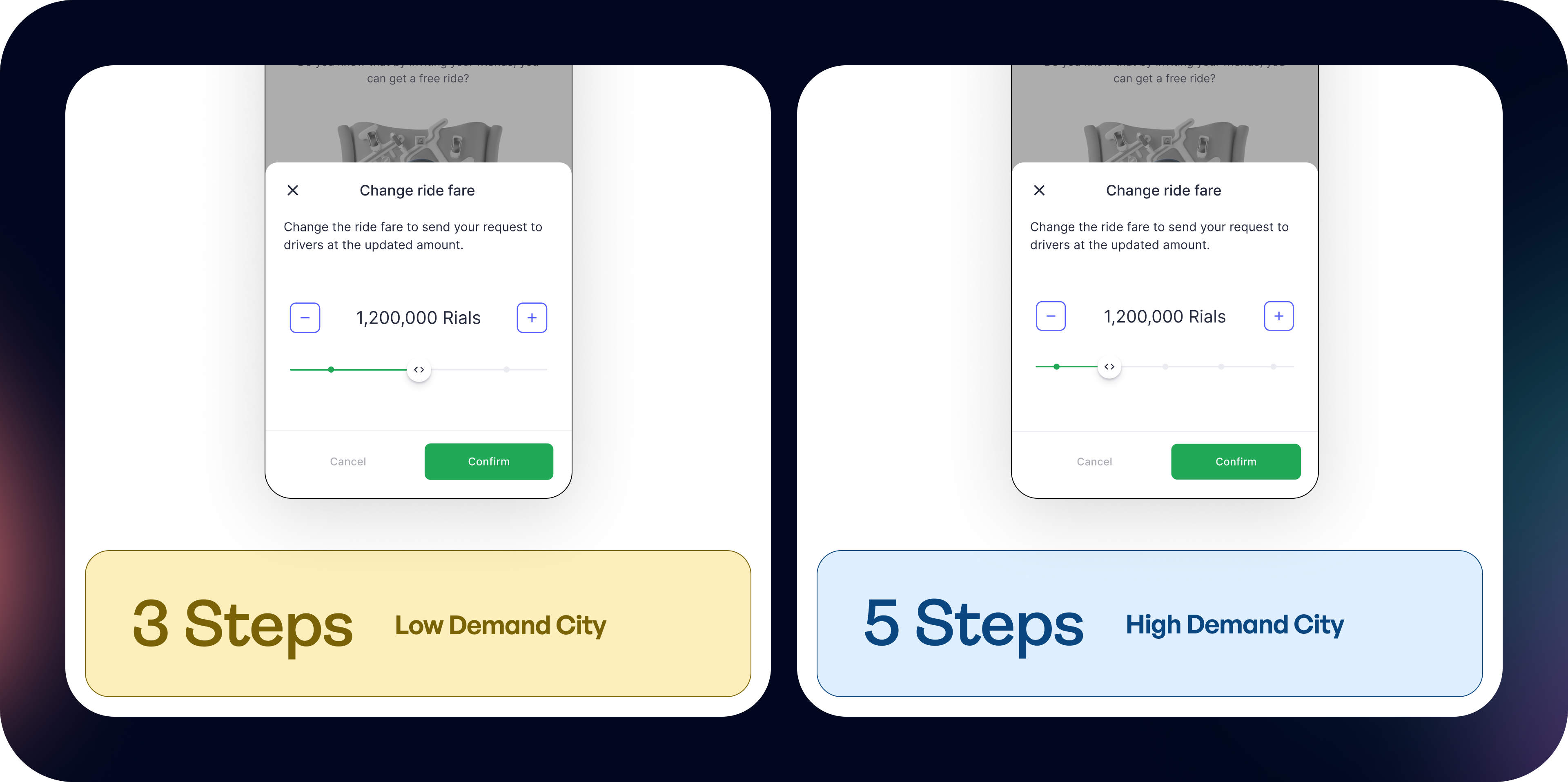 Visually, the bottom sheet is lightweight and focused: one clear title, one line of explanation, the price control, and two actions, Cancel or Confirm. No extra ride types, no hidden behavior. This keeps the interaction fast for time-sensitive passengers, understandable at a glance, and simple enough to fit within our technical and regulatory constraints.