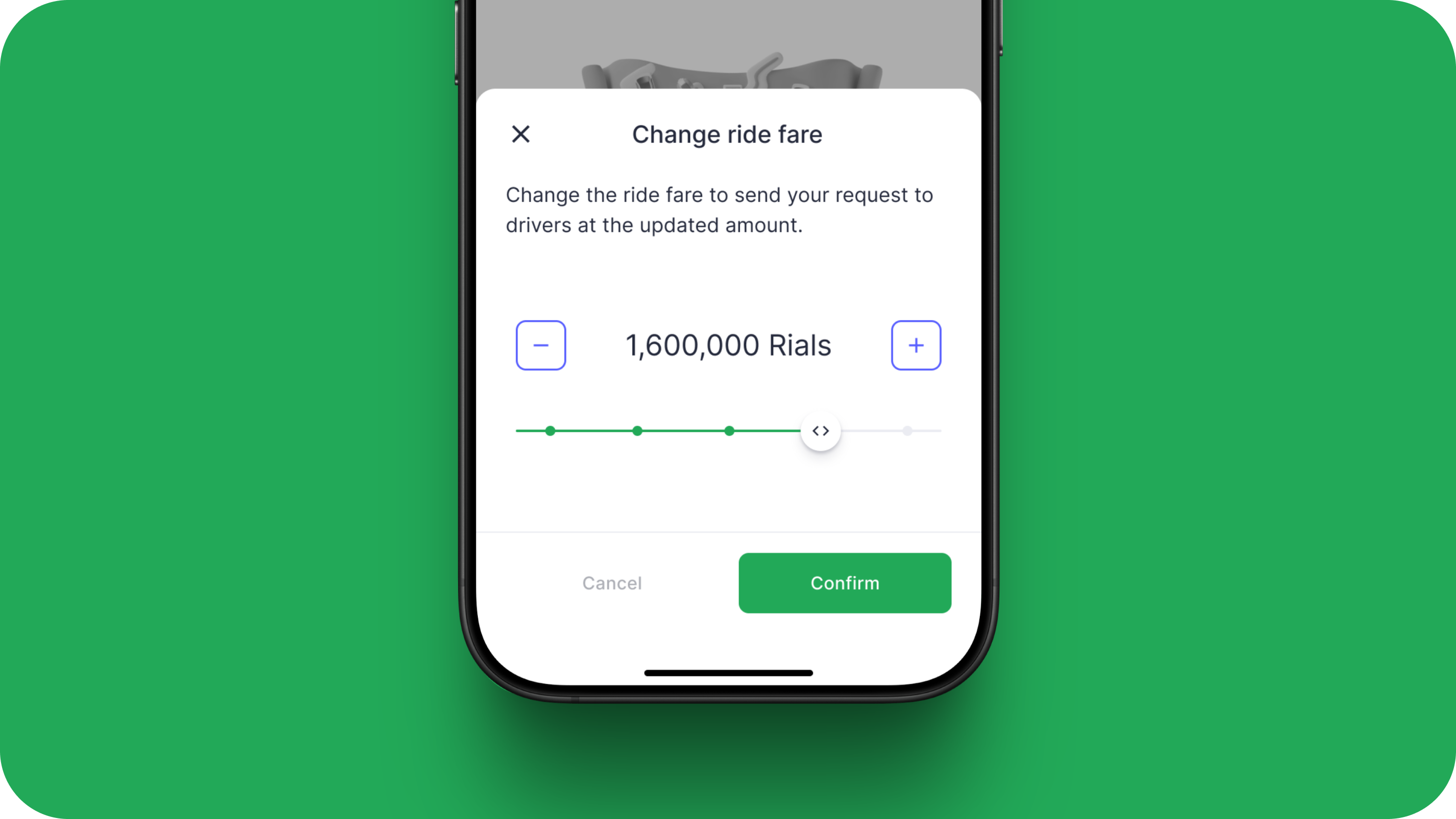 The control is built around stepped price points instead of a fully open range. The slider moves in ~20% increments, and the + / – buttons let passengers fine-tune the amount without needing dozens of taps. The current fare is always visible in the center, with supporting copy that explains what’s happening: you’re resending your request to drivers at this new price.