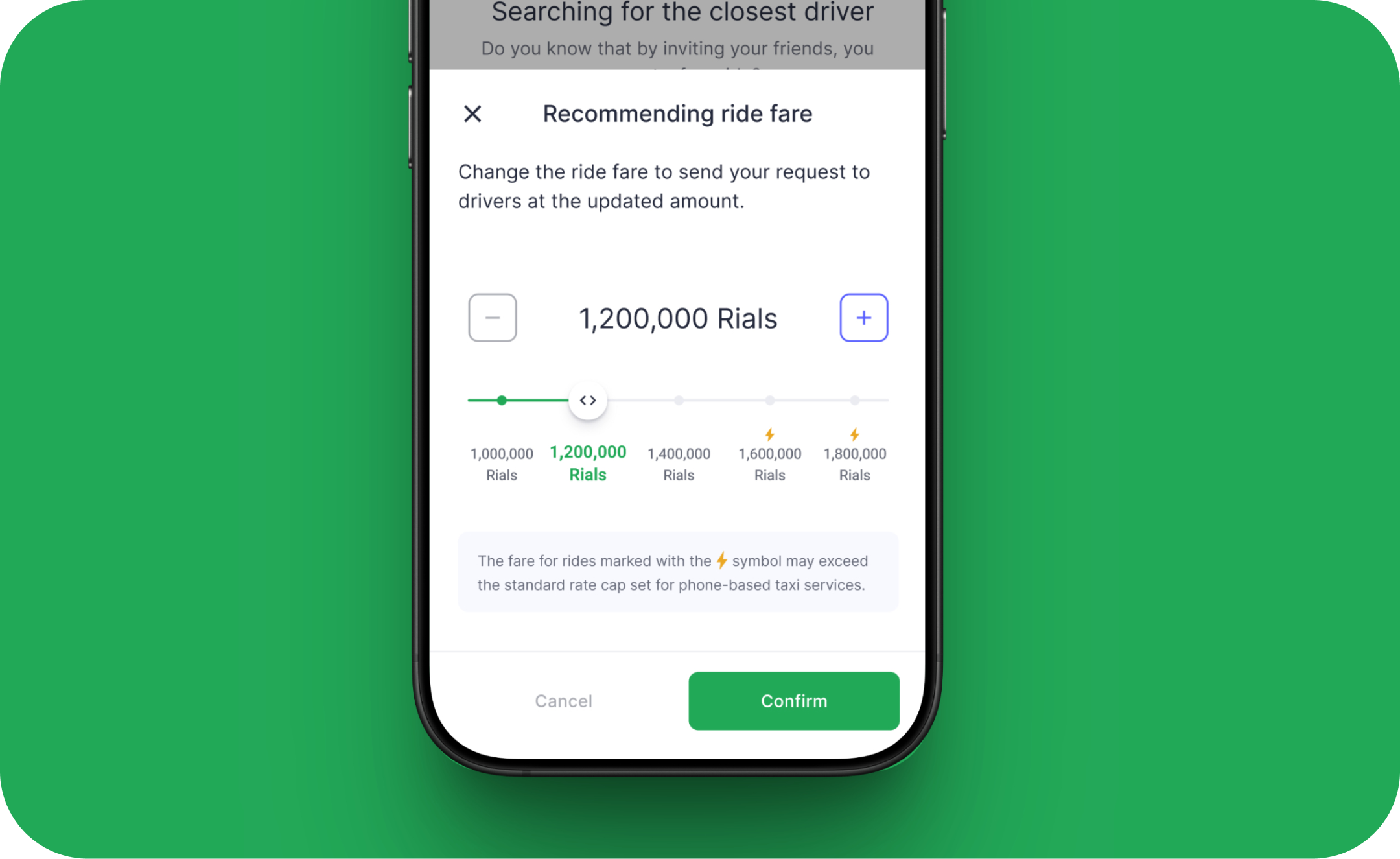 The sheet’s primary goal is singular to "Change ride fare". By placing this action in a focused bottom sheet, it isolates the user's decision from the main map/booking flow, reducing complexity and directing them toward a quick resolution when waiting for a driver (Searching for the closest driver).