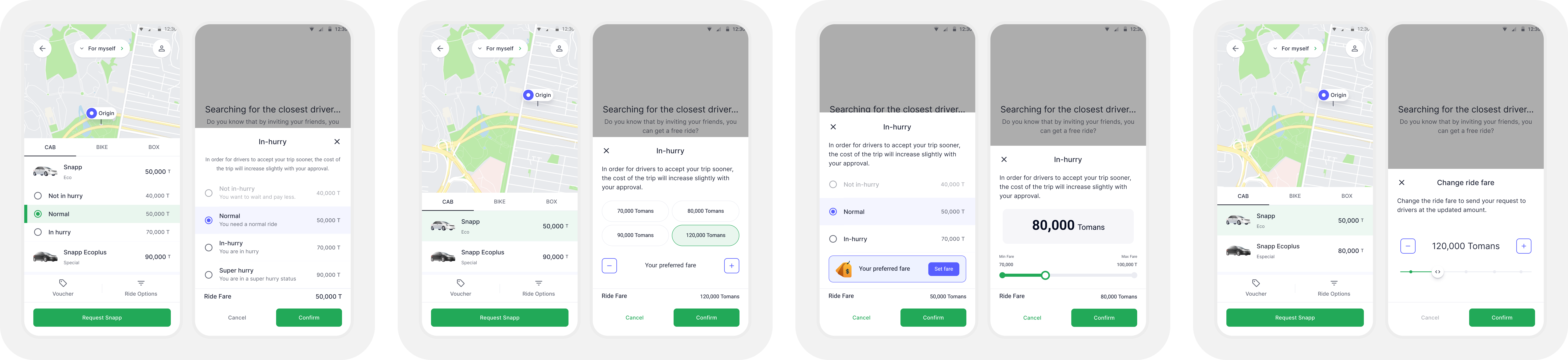 As a next step, we designed Flexi Upfront, letting passengers choose their preferred fare before requesting a ride, directly on the price check page. Instead of waiting to see if drivers would accept and then increasing the fare on the waiting screen, passengers could set their price from the start based on how urgent their trip was.