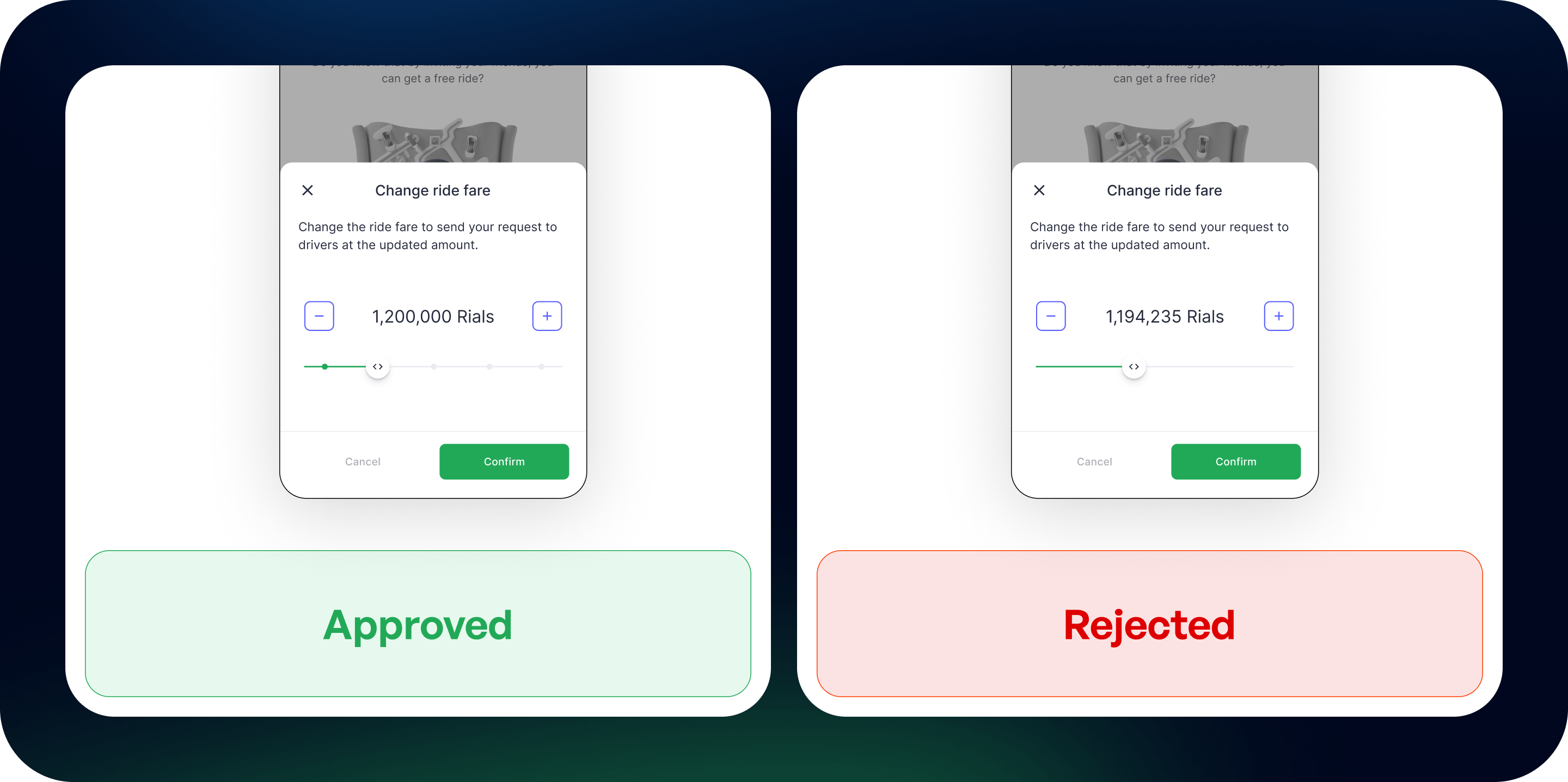 Then, we experimented with predefined fares and more granular controls using plus/minus buttons. The idea looked flexible in Figma, but during discussions it was obvious that the technical load would be high, and simple actions, like raising the fare, would feel slow and frustrating for passengers. We also tested a later version with a bottom sheet and a wide-range “preferred fare” slider. It initially seemed powerful, but choosing a precise amount within that range would be confusing and difficult to control in practice.