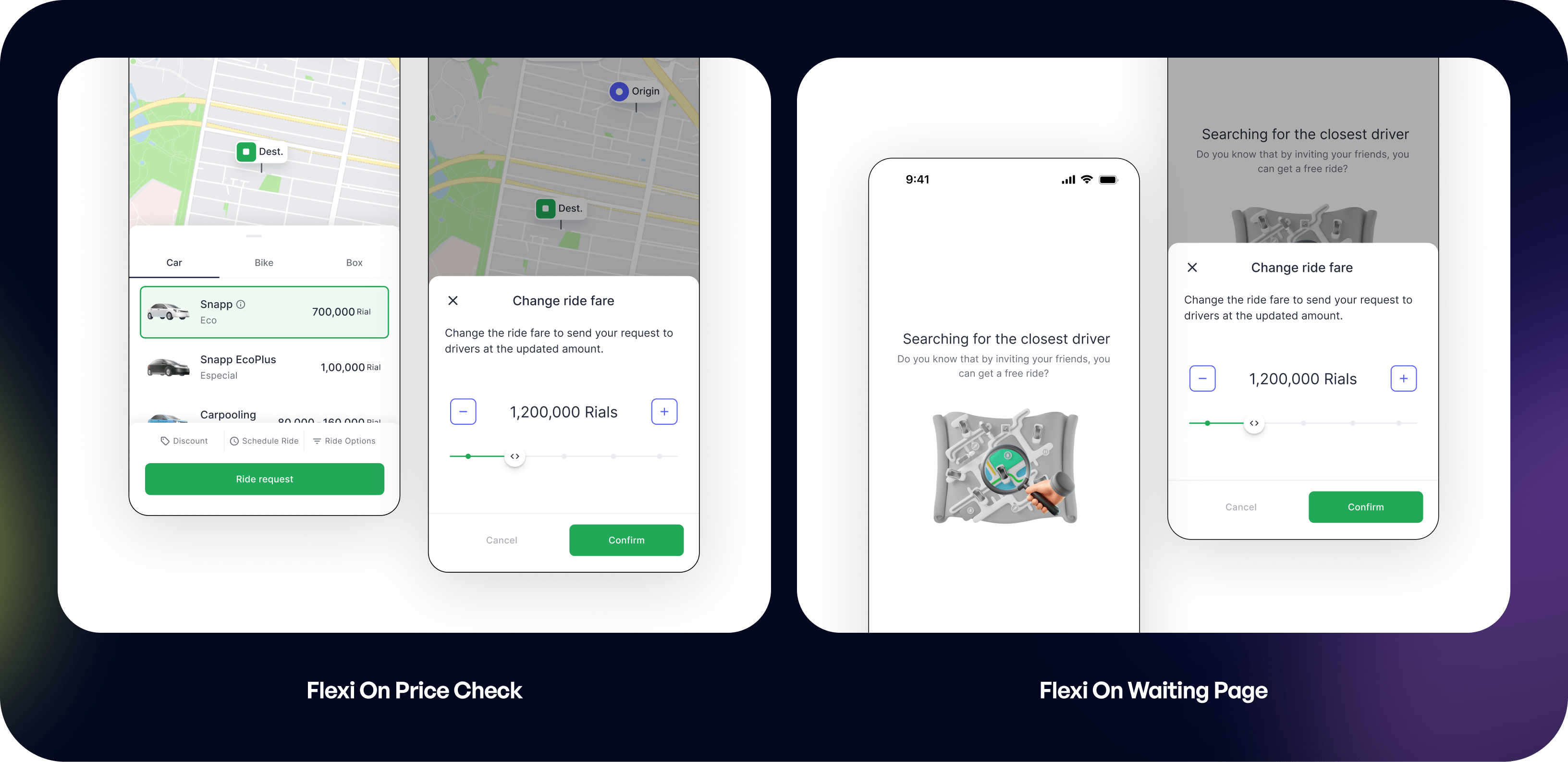On the Waiting page, Flexi works as a quick reaction tool. When a passenger sees that drivers are not accepting their request, they can raise their fare instantly without restarting the flow. This is especially helpful for people in time-sensitive situations. We removed anything unnecessary here and kept the interaction fast and simple, since the user’s priority is to get matched as soon as possible.