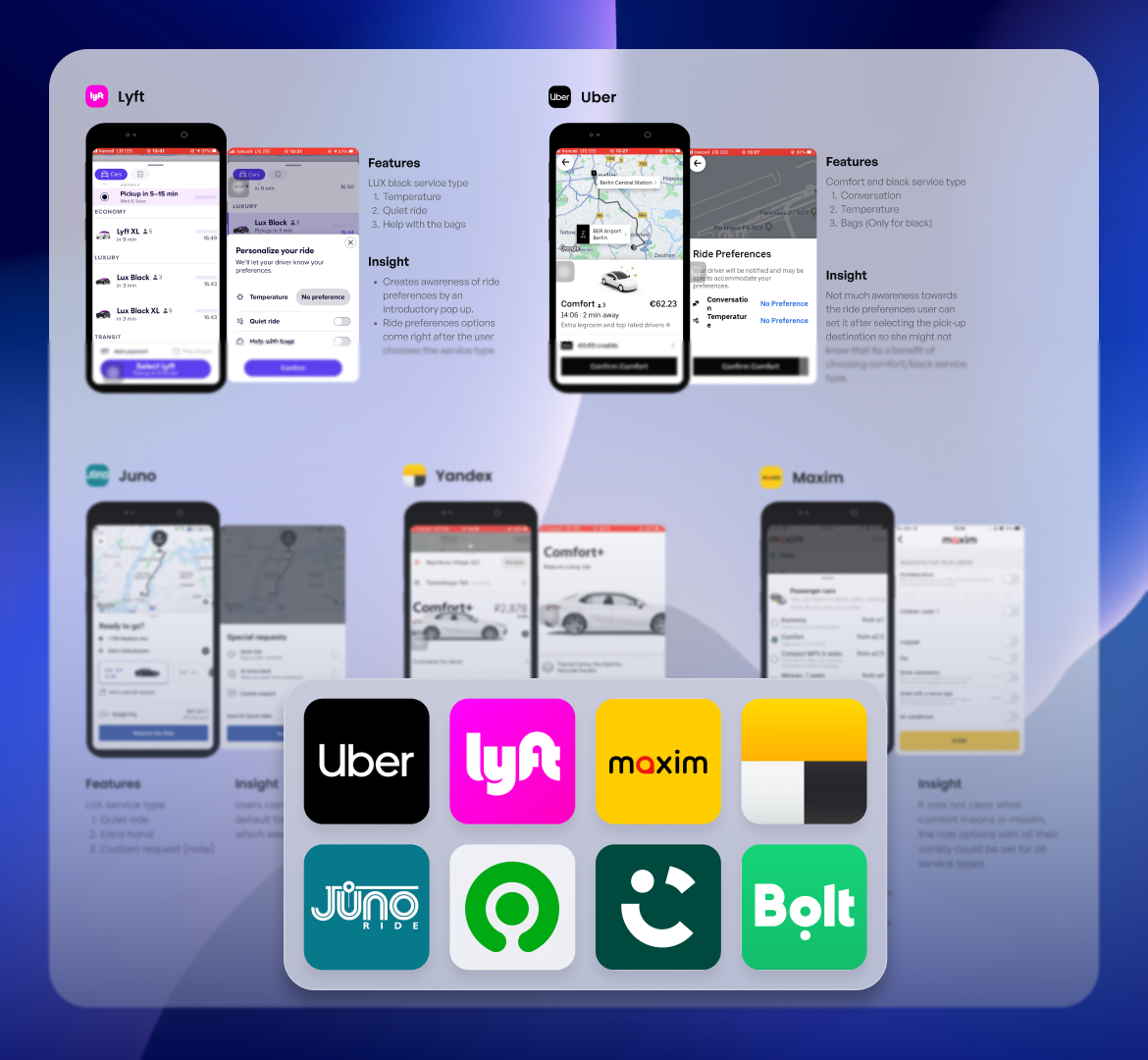We sent online surveys to both passengers and drivers to gain insights into their problems related to ride preferences, and we performed an in-depth competitor analysis to understand our rivals’ features and gather valuable insights.