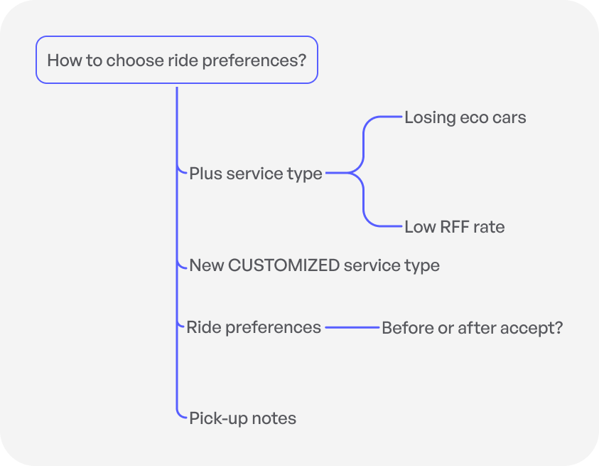 After that discussion, we realized we had two main approaches for showing ride preferences to drivers. One option was to reveal these choices after the driver accepted the ride, which would keep acceptance rates steady but might cause more cancellations.