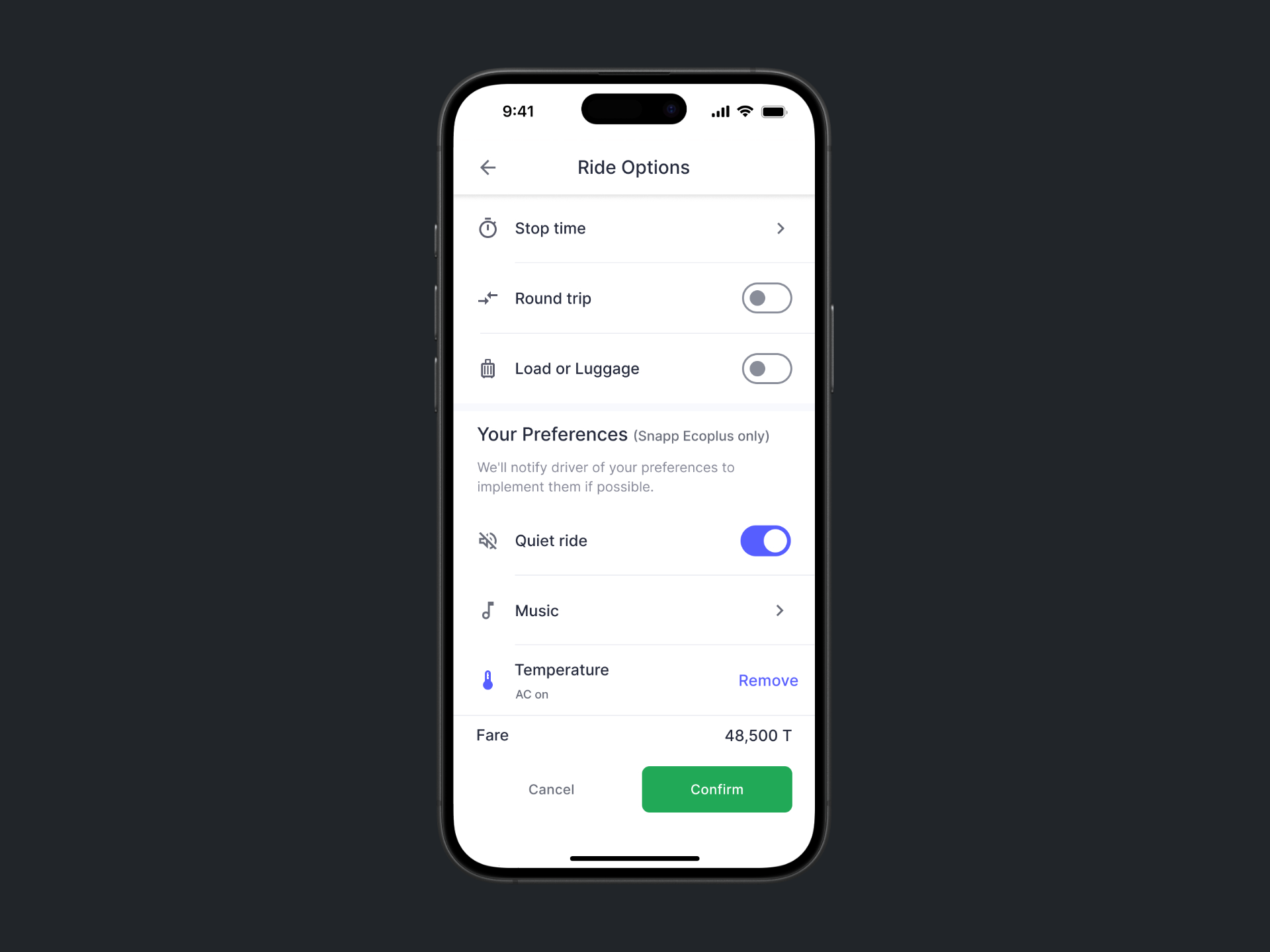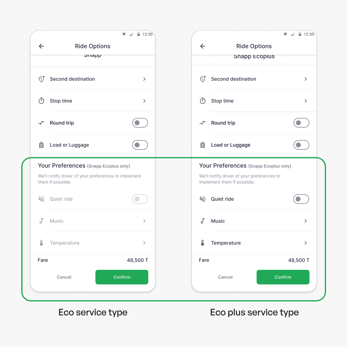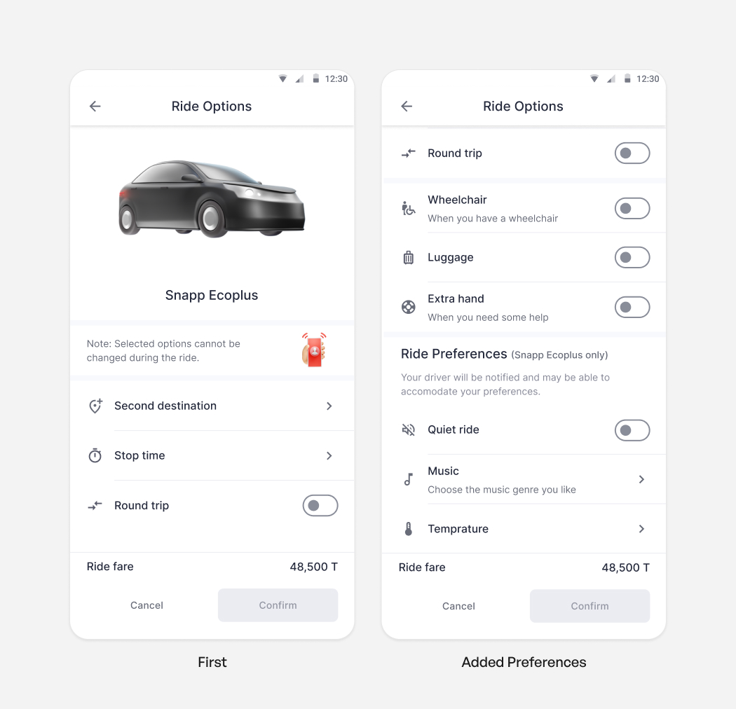 To raise awareness about ride preferences among all users, I integrated these options into the eco service type interface, displaying them as disabled. This approach visually informs users of the available preferences, enhancing their understanding without enabling selection for eco rides.