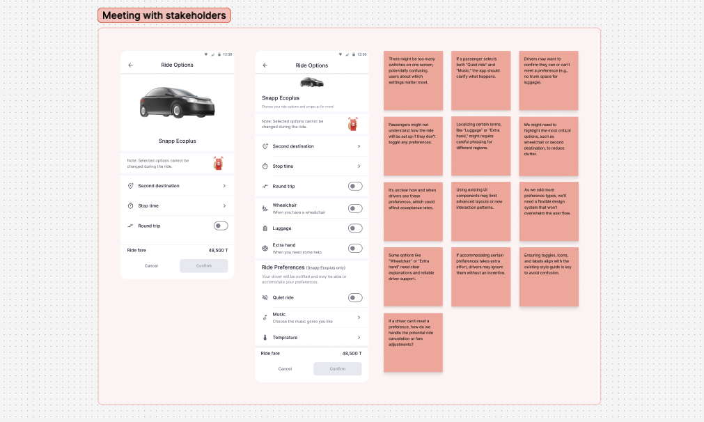 With insights from the social report, online surveys, and our team discussions, we put together a list of ride preferences that Snapp could realistically support. After that, we worked out exactly where and how each preference would fit into the user flow, keeping things as seamless and intuitive as possible for both passengers and drivers.