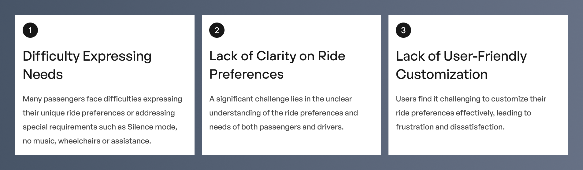 We set out to systematically address the core needs of our passengers and drivers, ensuring our approach tackled both the immediate challenges and the overarching goal of a more enjoyable ride experience.