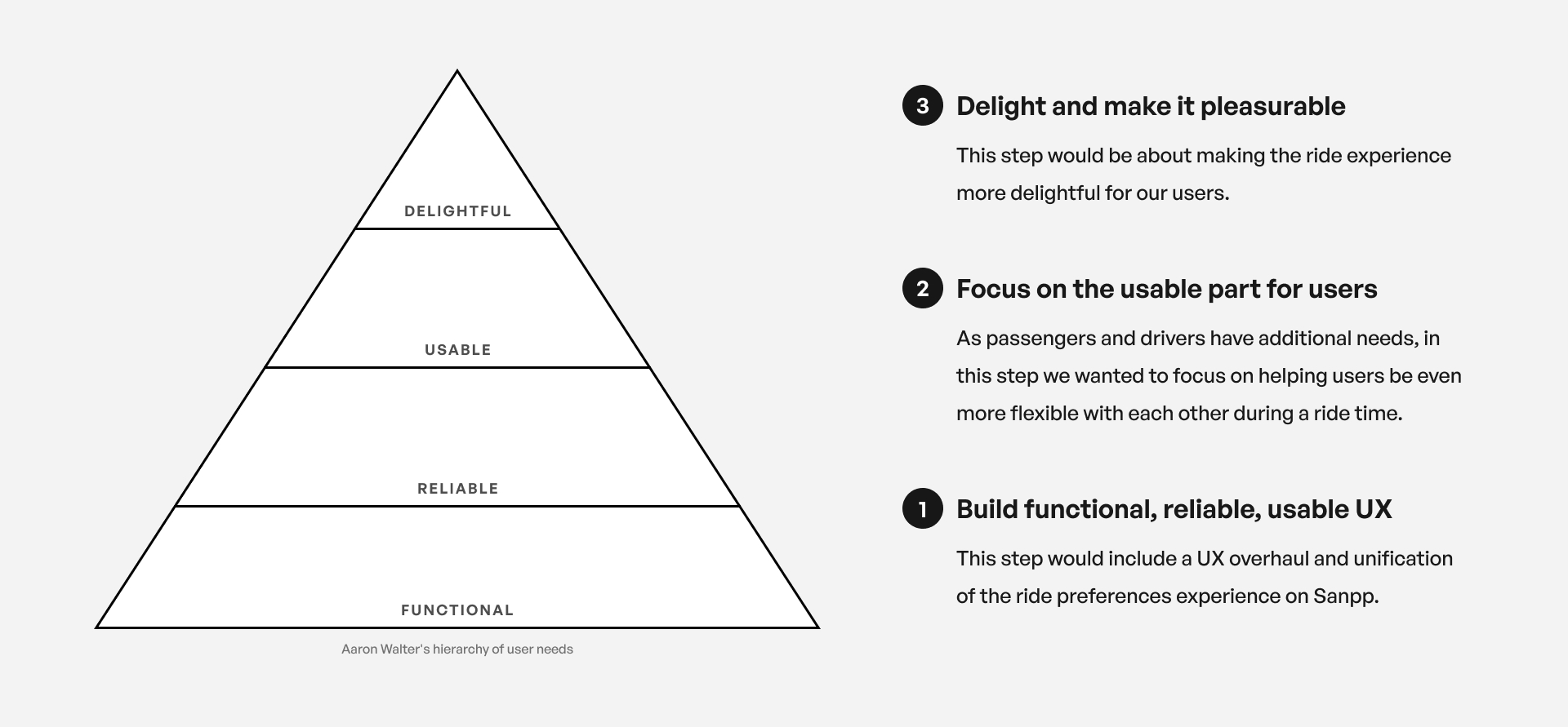 So we needed a clear strategy to tackle the ride preferences problem. Drawing inspiration from Aaron Walter’s user needs pyramid, we decided to build from the ground up.