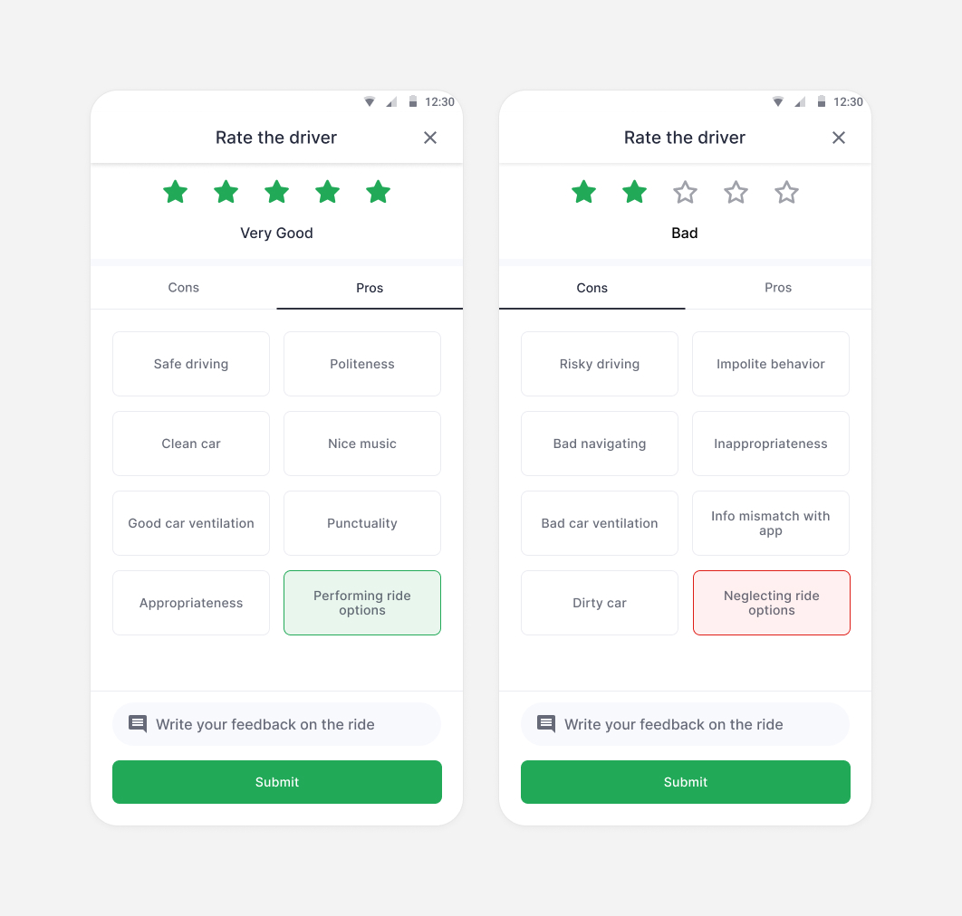 To keep track of how well drivers honor passenger preferences, we added a dedicated item in the rating options. This not only reassures users that their requests are noted and monitored, but also encourages drivers to meet those preferences, reinforcing a sense of care and accountability throughout the ride.