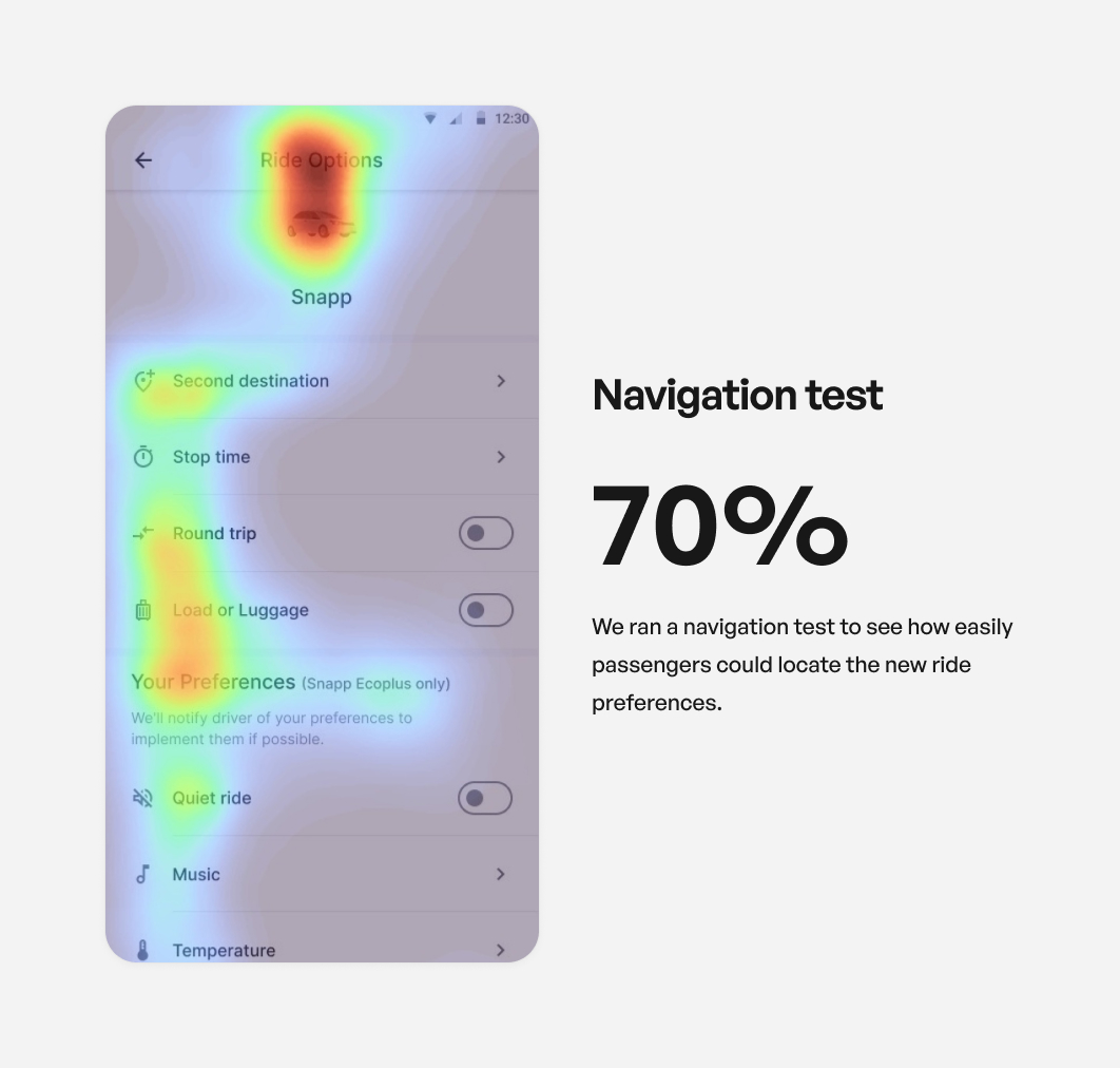 To ensure that our newly introduced Ride Preferences were easily discoverable and intuitive for users, we conducted a navigation test. The results showed that 70% of participants successfully found the Ride Preferences feature during the test, which aligned with our product team’s benchmark for findability. With this positive outcome, the team felt confident that the redesigned Ride Preferences would effectively guide users toward personalized ride options.