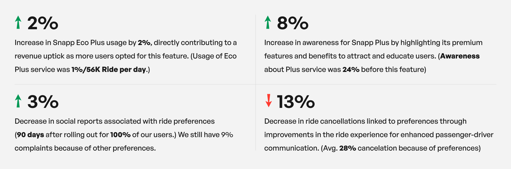 - 13% Decrease in ride cancellations linked to preferences by through improvements in the ride experience for enhanced passenger-driver communication. (Avg. 28% cancelation because of preferences)